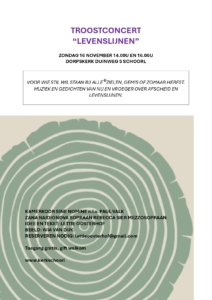 Veel mensen hebben toen een kaarsje aangestoken en werden verwarmd door teksten en muziek. Dit jaar is de titel van het concert “Levenslijnen”. Door de kunst van Wia van Dijk worden de levenslijnen ook in beeld gebracht. Deze keer zingen Zana Naidionova en Rebecca Sier de soli.
